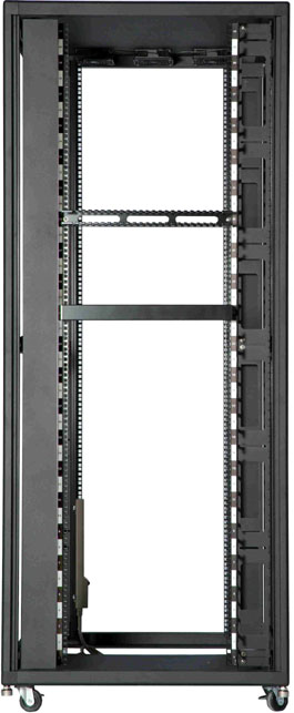 機櫃標準配備組成由可拆式前後蜂巢孔門附隱藏式門鎖及鑰匙,上抽式散熱風扇2顆、模組化上下蓋板、鋁製ADC-12三向接頭、上下結構框組,主結構鋁柱組、以實心三向接頭及空心鋁擠型鋁柱組合而成,副方孔活動柱,U數貼紙、滑軌橫柱、AC110V~220V-15A八孔電源組,不銹鋼框架組合螺絲,可拆式散熱側板組、活動煞車輪、地平腳螺絲組、M5(M6)活動螺母,M5(M6)彈片螺母、M5(M6)面板螺絲、方孔工具等零件組合而成,二旁可裝100mm寬之鋁製垂直理線槽(加寬型機櫃選購配備),供垂直及水平跳接線使用